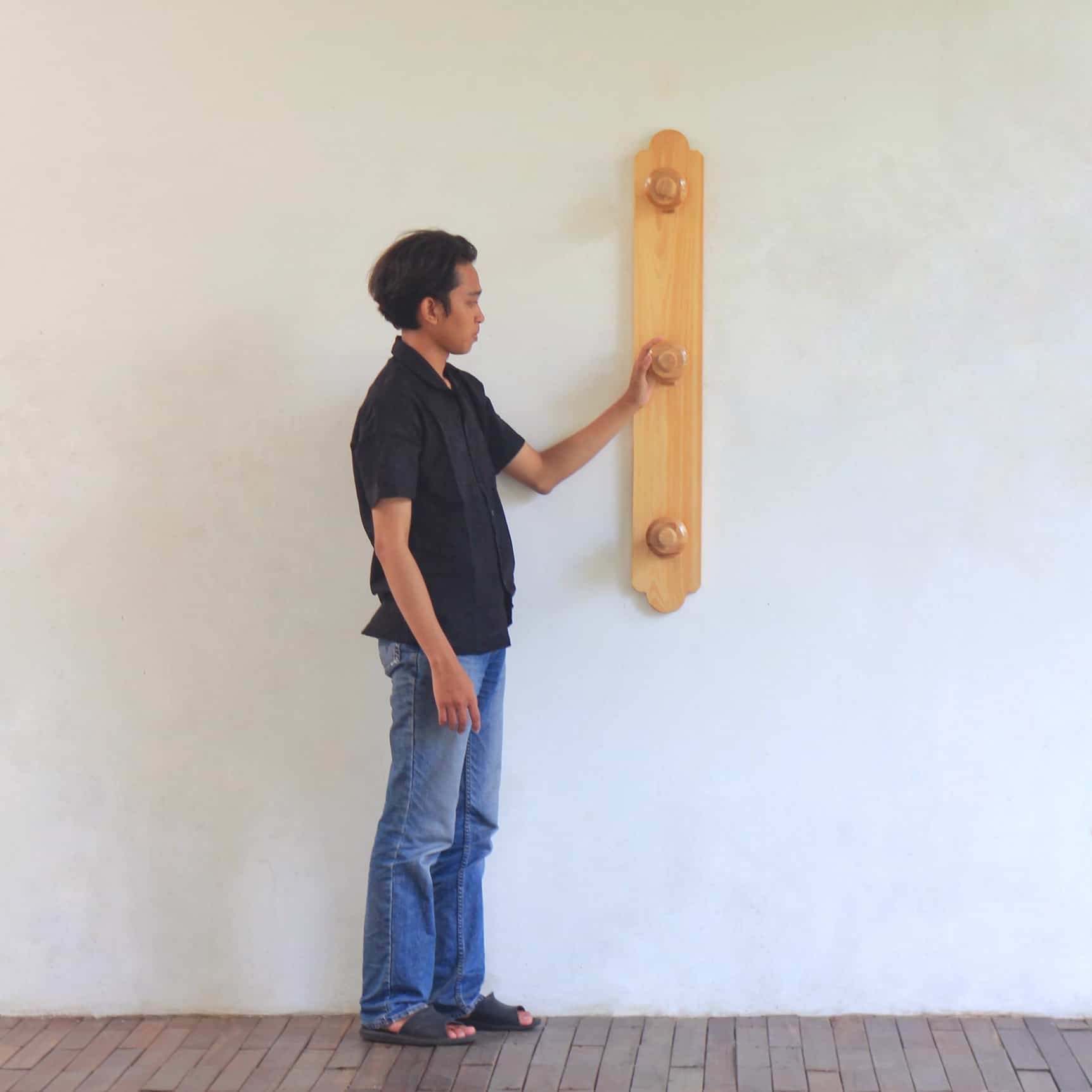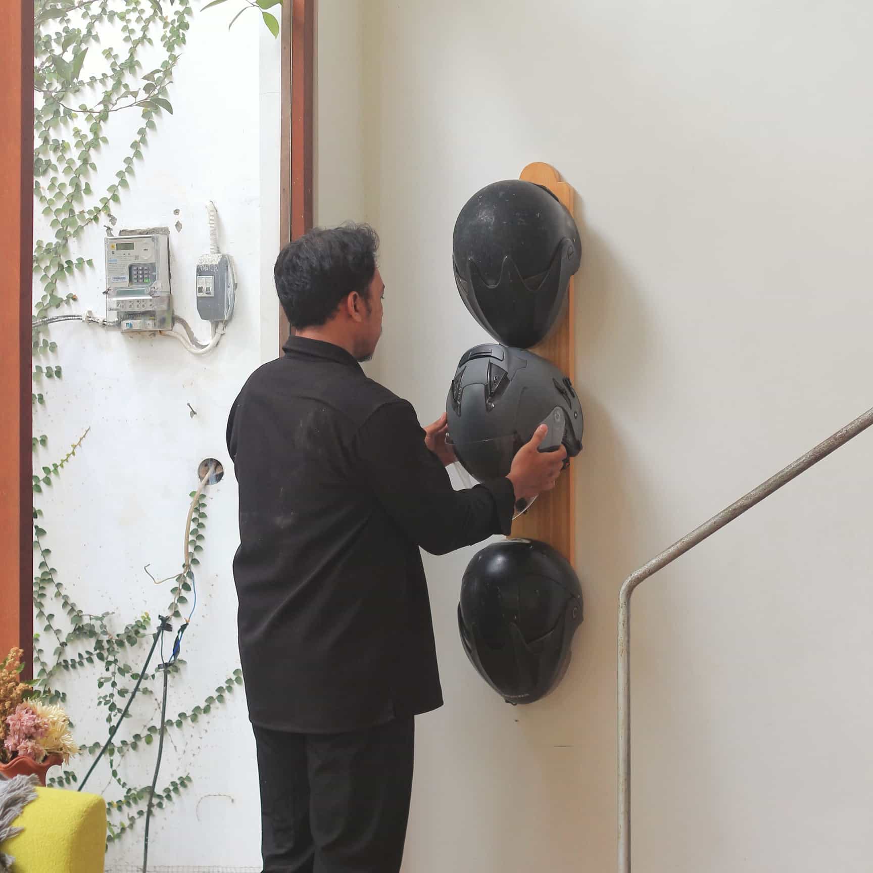 Bonang Helmet Shelf adalah rak helm kayu terinspirasi dari filosofi alat musik gamelan Jawa, Bonang, yang melambangkan harmoni dan keteraturan, sekaligus menjaga helm tetap rapi dan aman.