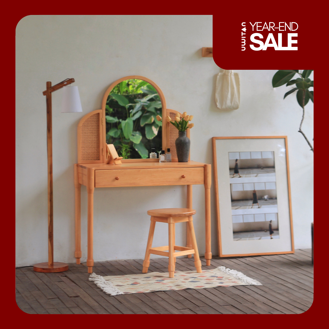 Harumi Dressing Table adalah meja rias bergaya natural klasik dengan cermin lengkung dan panel rotan anyam di kedua sisi, dilengkapi laci penyimpanan yang praktis, cocok untuk melengkapi kamar tidur dengan sentuhan hangat dan estetis.