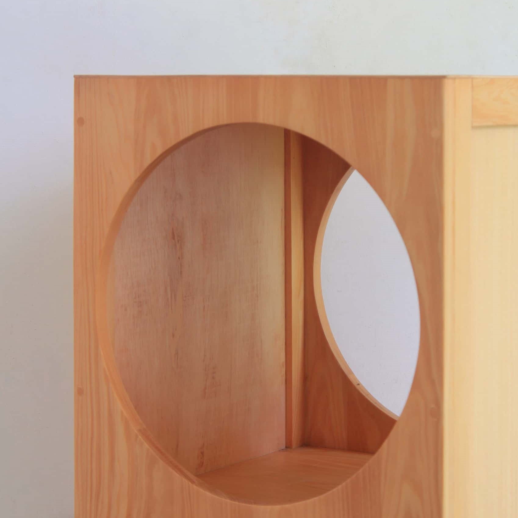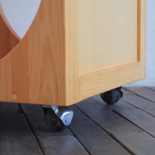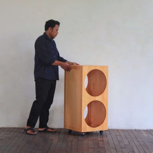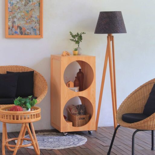 Kubo 2 Shelf adalah rak minimalis dengan dua ruang terbuka berbentuk lingkaran, dilengkapi roda untuk kemudahan mobilitas.