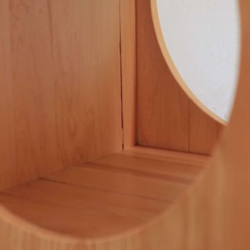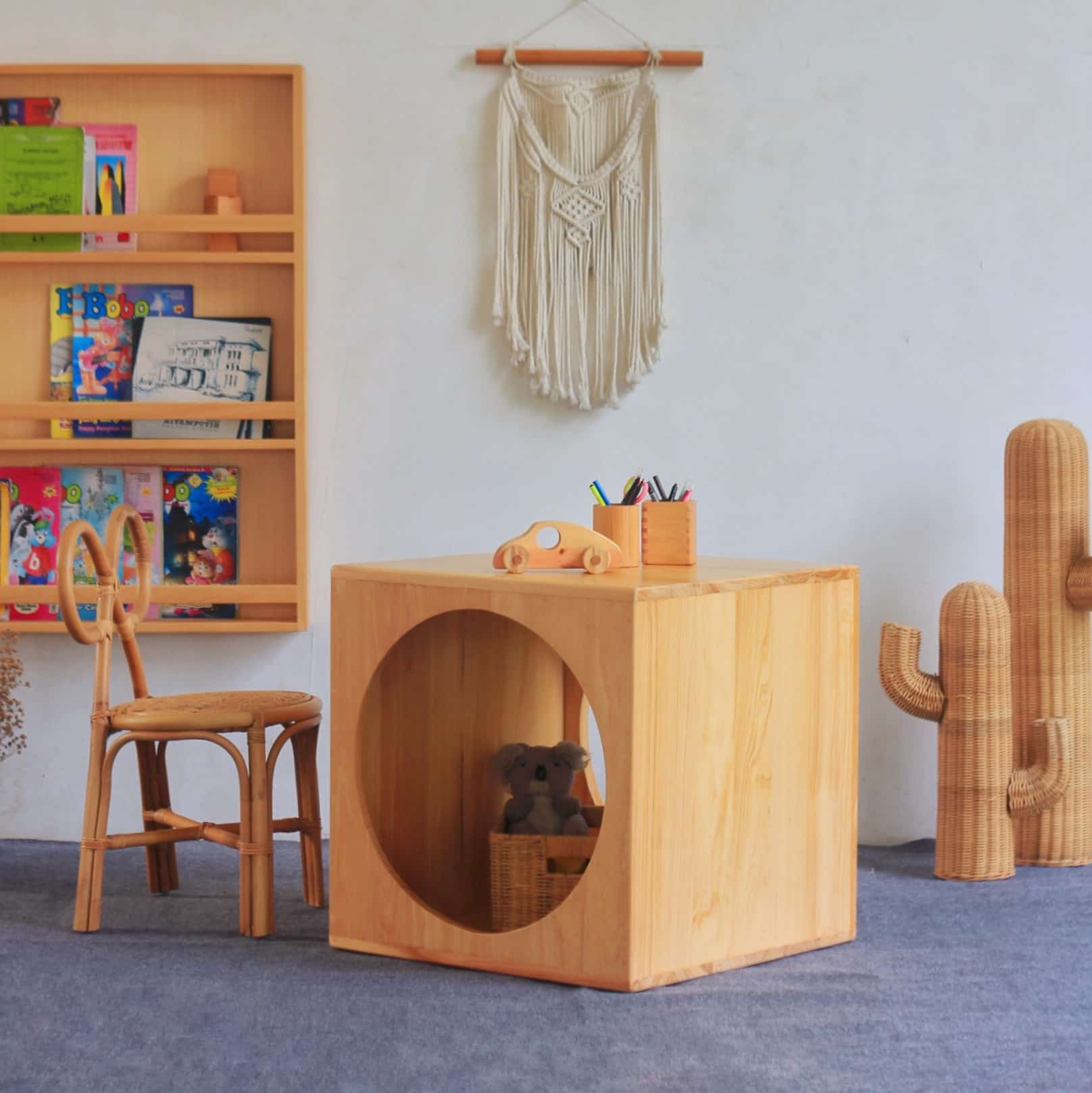 Kubo 60, meja belajar anak dari kayu solid dengan desain minimalis dan multifungsi. Bisa jadi meja belajar, area bermain, atau tempat simpan mainan.