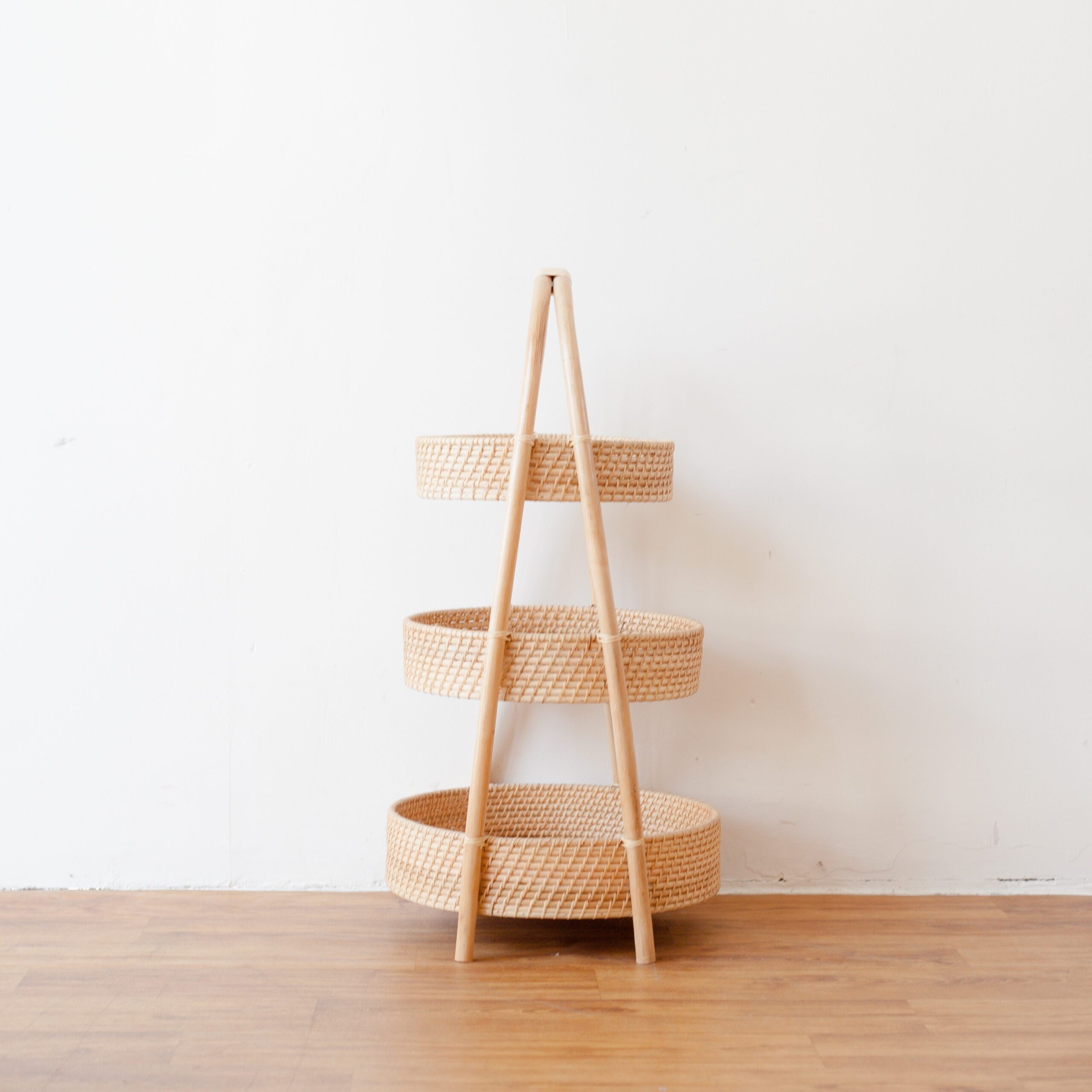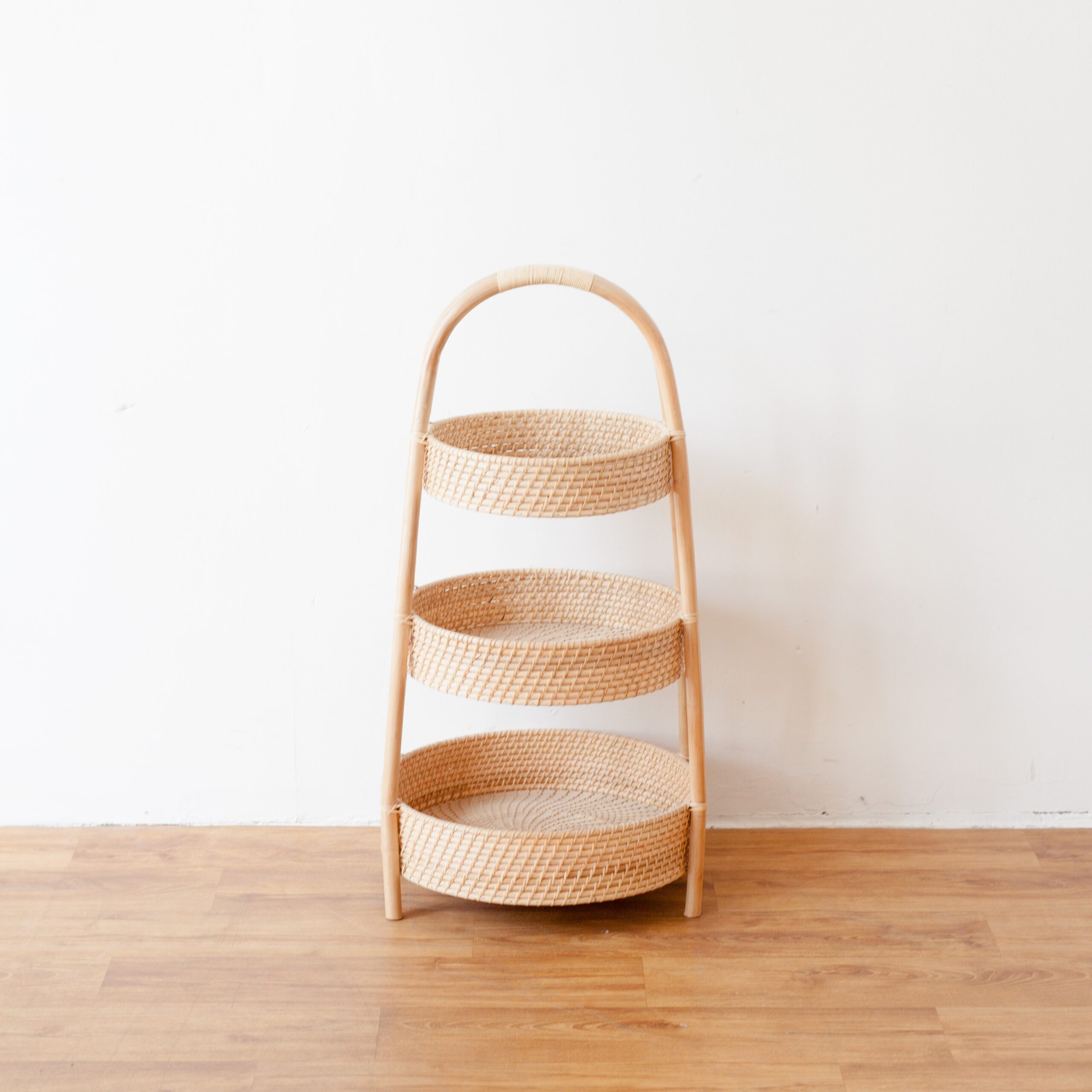 Rak tingkat berbahan dasar rotan yang memiliki tiga susun rak berbentuk bundar. Gunakan rak tingkat rotan sebagai storage untuk menyimpan buku, majalah, atau barang kebutuhan lainnya. Letakkan rak tingkat ini di ruangan yang membutuhkan tempat penyimpanan, seperti ruang tamu atau ruang keluarga.